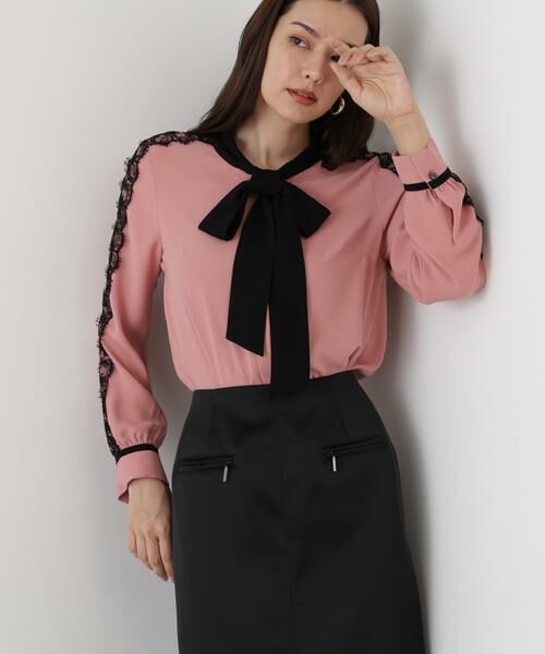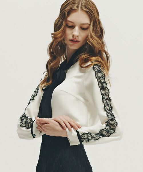 女性らしさを高める配色リボンタイブラウス。程よいハリを持ちながらもキレイ目な表面感が特徴的なストレッチ素材を使用したブラウス。シワになりにくくイージーケアでお召しいただけるので、ビジネスシーンにもお勧めの一着。フロント部分に大きめなバイカラーリボンが女性らしく華やかな印象にまとまります。バイカラーのレースを肩から袖かけてあしらい華やかさをプラス。
