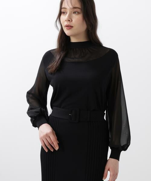 ネック周りに透け感があり、繊細なシアー感が今年らしいエレガントなデザインです。袖のシフォンの陰影ある表情、袖のギャザーによるふんわりとした立体感のあるシルエットが華やかなデザインニットです。