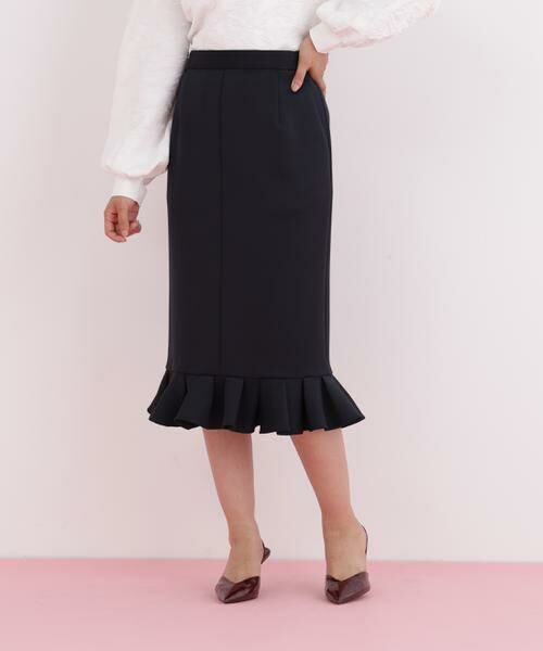 ・お届け予定日:1月下旬頃ダンボール素材を使用したスカート。ウエストから程よくタイトなシルエットで、裾にあしらったタックフリルが女性らしい印象を演出します。歩くたびに揺れるフリルが表情を添え、華やかさをプラス。同素材のブラウスとのセットアップスタイルは、きちんと感のあるシーンにもおすすめです。【素材説明】スキューバージャージのような反発感を持つダブルジャージ素材。ポリウレタン混による優れたストレッチ性で着心地が良く、程よい肉感とすっきりとした表面感、しなやかなタッチが上品な印象を与えます。【商品特性】ストレッチあり/裏地付き/前ポケット×2/後ファスナーあき/後にベンツあり/ひざがかくれるくらいの丈