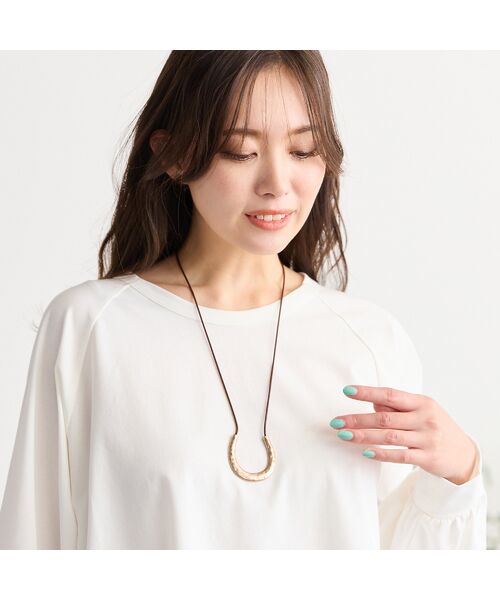 レザー風コードにブロンズ調のU字型モチーフが付いたネックレス。