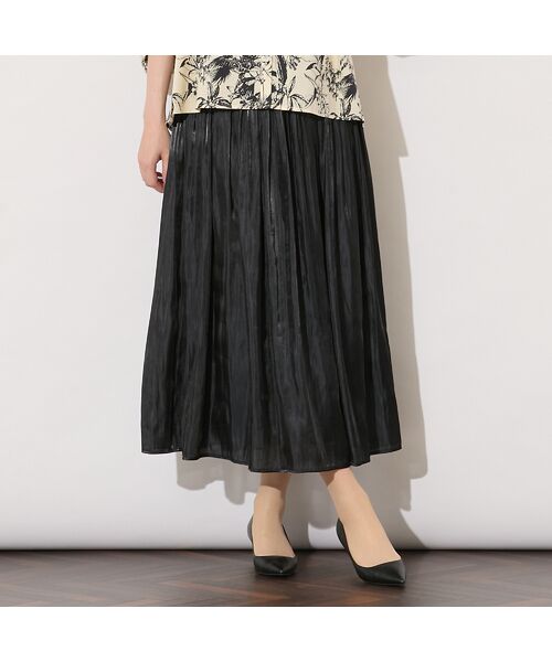 光沢感のある素材を使用し、ランダムに入ったプリーツがさり気なく、フェミニンな印象のスカート。