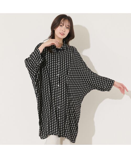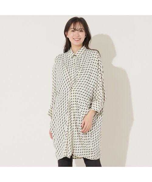 モノトーンの幾何柄プリントが適度な存在感の、チュニック丈ブラウス。