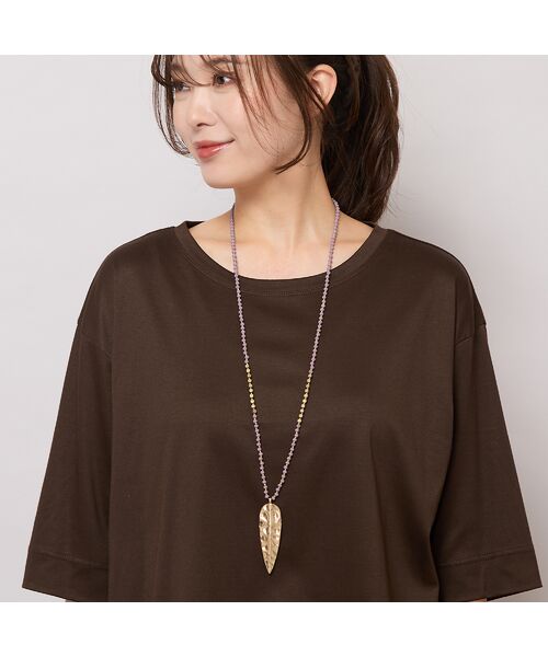ロング丈にゴールド調の細長い葉っぱモチーフが付いたネックレス。