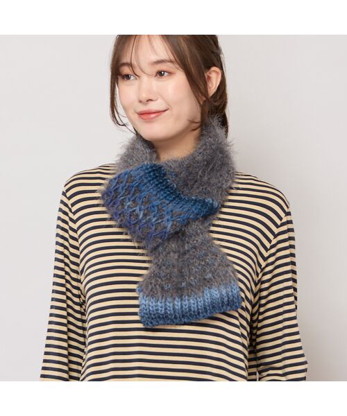 ざっくり手編みの様な編み目の面と、毛足のあるシャギーヤーンの面がドッキングされていて、気分で裏表を変えられるリバーシブルで、コーディネートの幅が広がります。