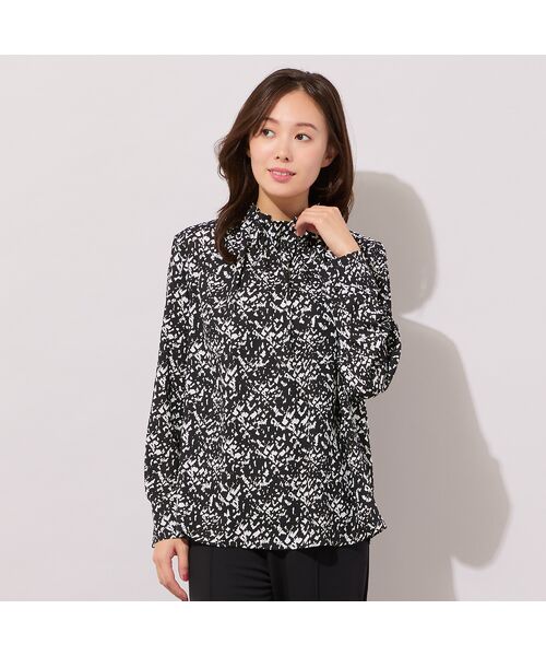 ■平ゴム使いのギャザーネックがエレガントな幾何柄ブラウス■