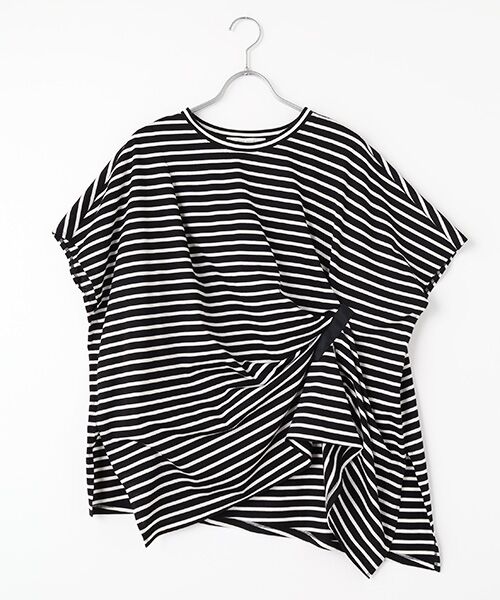 ドレープがユニークなチュニックブラウス。柔らかくしっとりしたベーシックな天竺素材。アメリカのピュアオーガニックを原料としています。腰回りをカバーできる着丈と肩回りをカバーできる袖丈でモードと着やすさが両立したアイテムです。「タイプライタードロストパンツ(A1551FP445)」や「ポンチ×綿フライス(A1551UP484)」とのあわせがおすすめです。