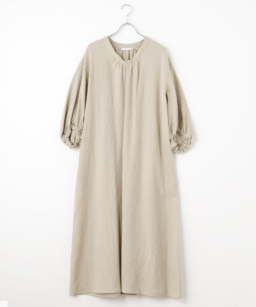 Aラインシルエットのワンピース。40番手の麻の糸を織り上げた、適度なハリコシ感と柔らかさを併せ持つ素材。透けないので裏地無しでさらりと着ていただけます。7分袖のギャザースリーブと裾に向かってたっぷりと広がるAラインシルエットがきれいなワンピースです。袖は後ろ側がギャザーを多めにしているのでそのままでも、袖をたくし上げても豊かな表情が生まれます。後ろ身頃だけ高めのウエスト位置でギャザー切り替えを入れており、メリハリが生まれ前後で違う表情が楽しめます。