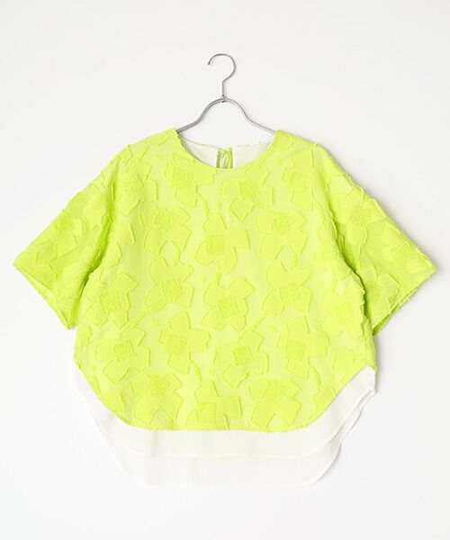 素材の迫力を活かしたシンプルなTシャツ型のブラウス。桐生産地で作成したオリジナルのカットジャカード。経(タテ)糸が細いナイロン、緯(ヨコ)糸がコットンなので透け感がありながらコットンのナチュラル感を併せ持っています。花モチーフですが幾何学的な表現にすることで甘さが抑えられモダンな印象です。透け防止のためにした身頃裏のコットンローンが裾からのぞき、レイヤード風に見えるデザインです。「カットジャガードフレアーパンツ(A1553FP032)」と合わせてもドレスのように着ていただいても素敵です。