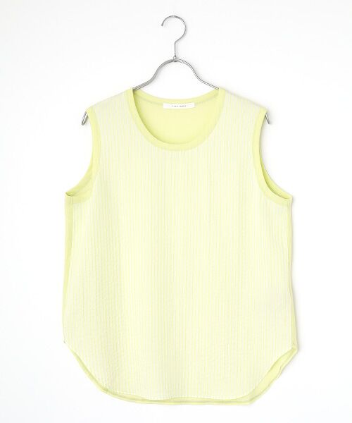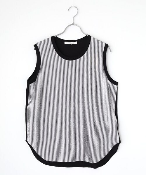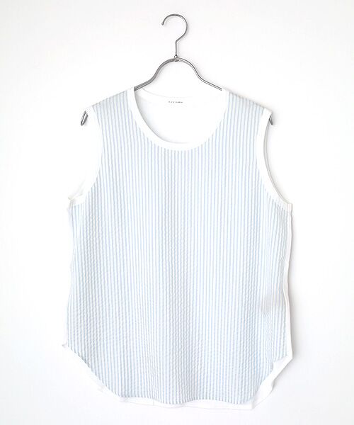 ノースリーブブラウス。カルフォルニアのサンホーキンバレーの雪解け水で育った綿花を使用し、超強撚に撚糸したシアーで清涼感のあるジャージ素材。ソフトな風合いと発色が特徴で吸水性にも優れており夏素材としてぴったりです。強撚素材は、本来ジャリジャリした質感ですが、原料のソフトな風合いにより柔らかい仕上がりです。前身ごろにはポルトガルのSOMELOS社のテンセル100%サッカーストライプをドッキングし、ブラウスの様でありながら気軽に着ていただける1枚です。