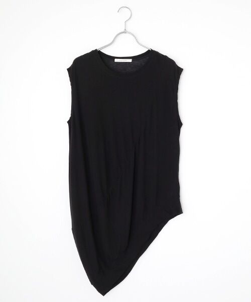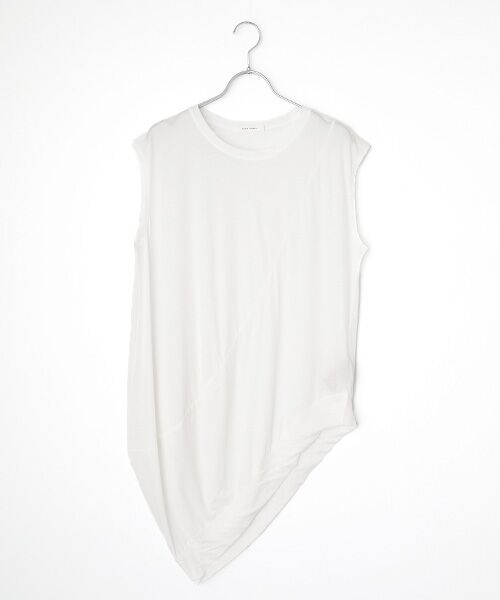 歪んだシルエットのプルオーバー。80番手の強撚糸を1本取りで編み立て、あえて斜行させたジャージー。一度洗いをかけることで斜行が安定し生地に独特な表情が生まれます。後ろ側にドレープが多めに出るように設定しています。薄い素材ですが素材がたっぷりしているので透け感を気にせず着ていただけます。裾でブラウジングできるので、体型に合わせて丈を決められることができ、いろいろなボトムに合わせられます。
