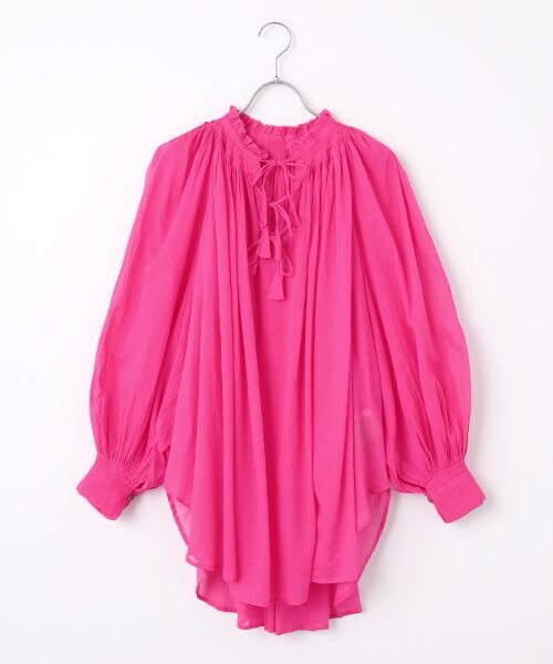 極薄の繊細なボイル素材にアンティークブラウスをイメージしたタックギャザーが印象的なブラウス。生地を惜しみなく使ったふんわりしたシルエットが特徴です。袖口のタックや襟元の花びらのような布飾りなどの手仕事もインドならではのテクニックです。新色にビビッドなピンクが登場。