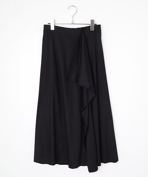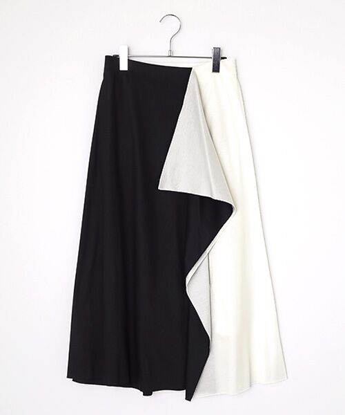 黒と白のバイカラースカート。しなやかな風合いと光沢をもったスムース素材。透けにくい白ですが裏地付きで安心感があります。前身頃のドレープがポイントです。シンプルなTシャツと合わせて着ていただけます。