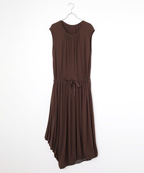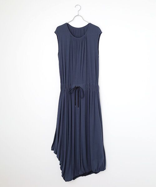 首回りやウエストにギャザーをたっぷり施しています。アシンメトリーの裾がユニークな一枚。