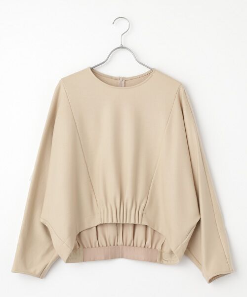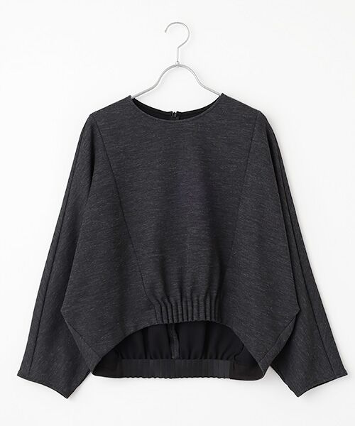 裾にゴムディテールを取り入れた、ドルマンスリーブの新しい表情をもつプルオーバー。後ろ丈が長く、丸みを帯びたバックシルエットが特徴です。特に印象的なのが裾のディテール。後ろ裾と前身頃の一部に、ゴムの幅に合わせて細かな均等ステッチを施すことで、ふくらみのある構築的なリブのようなフォルムを生み出しています。素材はカラーによって異なり、チャコールグレーは表裏で表情の異なるダンボールニット、ベージュは滑らかなタッチのウールミルドスムースを使用。同素材のストレートスカートとのセットアップはもちろん、前丈が短めのデザインを活かして、ワイドボトムとの相性も良好です。