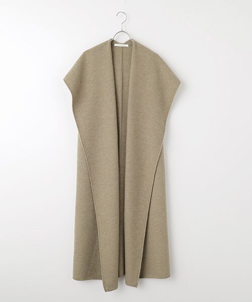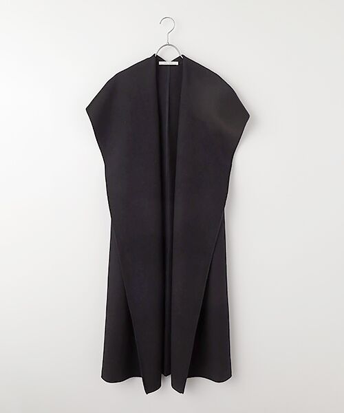 ニット編地を圧縮加工しカット縫製した手の込んだ仕様です。17,5マイクロンという非常に細く滑らか、バルキー性のある温かみのあるセミ梳毛の糸は圧縮加工をしても硬くならず柔らかな風合いを生み出すことができます。ポコポコとした表面感、適度なハリと柔らかさのバランスにこだわって圧縮仕上げをしています。ショールをまとったようなロングジレ。前身ごろにたっぷりとドレープが出る設計で、羽織るだけで美しいニュアンスが生まれます。大きめの襟はフードのようにしたり、大きめに折り返してショールのようにしたり、さまざまにアレンジしていただけます。「FLOAT圧縮ワンピース(A1553KA802)」と合わせるのがおすすめですが、季節の変わり目などはノースリーブの上に羽織るなど、活用の幅が広いアイテムです。