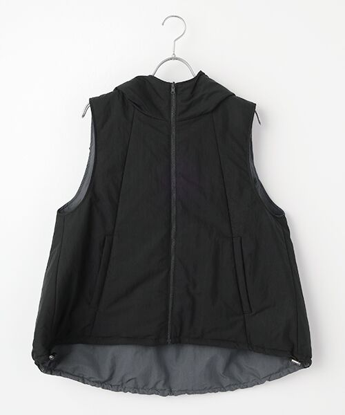 経糸に超長綿(スーピマコットン※米綿)、緯糸にはナイロンを採用した軽量感のあるタイプライター撥水素材。適度なハリ感を残した滑らかな風合いが特徴です。リバーシブル仕立てのフード付きベストです。裾のゴムコードを調整して、ボトムに合わせてシルエットをアレンジできます。前はすっきりと、後ろは下がりをつけた立体感のあるシルエットに設計しています。