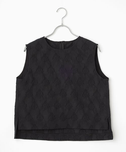 オリジナルの「膨れジャガード」を、ポリエステル×コットンで織り上げたブラウス。程よい光沢感と、形をきれいに保つハリ感が特徴。シンプルでコンパクトなノースリーブデザインに仕上げています。丈を少し短めにしているので、「オーナメントJQAラインフレアスカート(A1561FS051)」とセットアップで着用した際にバランスがとりやすく、すっきり見えるのもポイント。また、ワンピースのような雰囲気があり、セレモニーやお食事会など“ハレの日”の装いにもおすすめです。