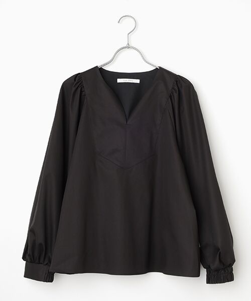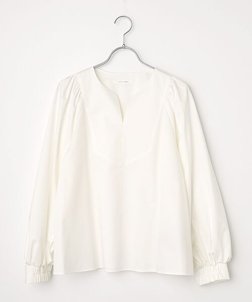 コットン素材で合成繊維風にストレッチを効かせて仕上げたコットンストレッチ素材。ラチネ組織(トルコ朱子・綾織りの一種)でサテンの様な光沢感とウォーム感を持ち合わせています。ストライプ柄の素材はスーピマコットンを使用したシルキータッチの目面の綺麗なタイプライター素材です。1枚で様になる短丈のプルオーバーブラウス。フロントヨークから入ったギャザーが立体的な袖を作り出します。袖口は半分ゴム入りでプッシュアップしやすくしています。「スーピマナイロンタイプライターパディングショートベスト(A1561FJ031)」との重ね着もおすすめです。