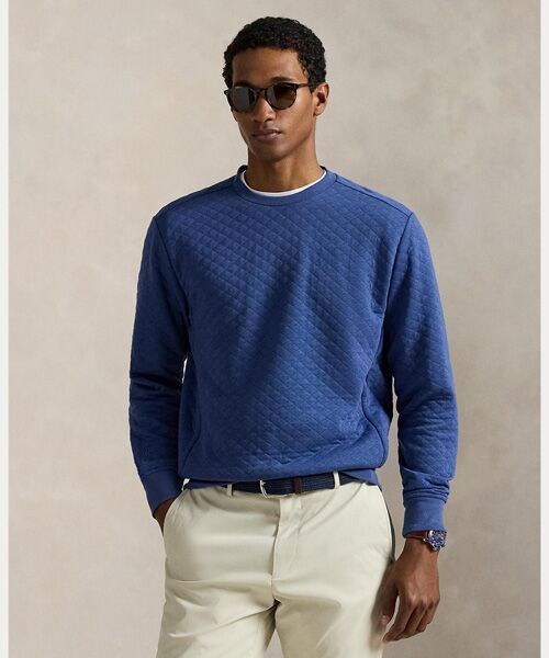 柔らかなダブルニット生地を使用したクルーネック スウェットシャツ。キルティングのデザインで、薄手ながら暖かな着心地を実現・クルーネック・長袖、リブカフス・サイドシーム ジップ ポケット / 特別に開発したRLXのロゴ入りジッパープル・右カフスの上と首の後ろ中央にRLXのロゴ刺繍・リブの裾・モデル身長185cm、着用サイズM※商品の色味は、光のあたり具合など諸条件により色感が多少異なって見える場合がございますので予めご了承下さい。
