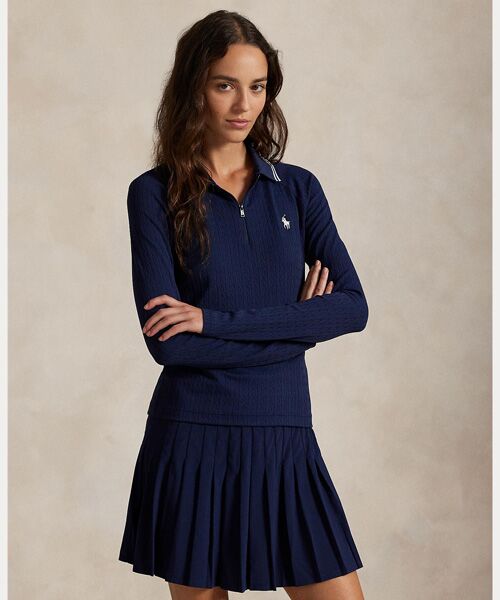 ダブルニット素材を使用し、ケーブルニットモチーフをあしらった長袖のポロシャツ。クォータージップの前立てと、襟に施したストライプのティッピングが特徴のバージョン。胸にシグネチャーのポニー刺繍のアクセント・スリムフィット / 腰丈・ストライプのティッピングを施したリブのポロカラー / クォータージップの前立て / 特別に開発したRLXのロゴ入りジッパープル・長袖のラグランスリーブ・左胸にシグネチャーのポニー刺繍・首の後ろ中央にRLXのロゴ・モデル身長178cm、着用サイズS※商品の色味は、光のあたり具合など諸条件により色感が多少異なって見える場合がございますので予めご了承下さい。