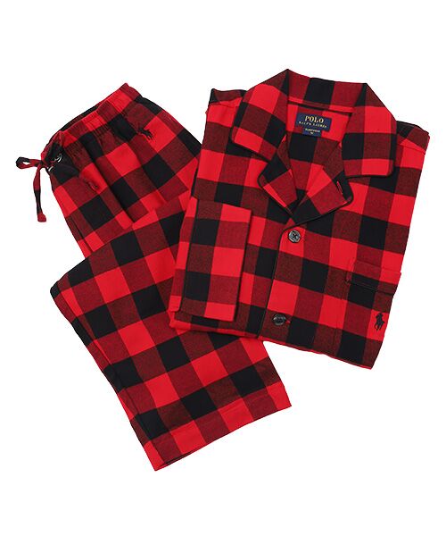 オーガニックコットン100%による両面起毛のフランネル生地を使用した長袖パジャマセットです。ゆったりとしたサイズ感で、リラックスした着心地が特長。レッドベースのオーセンティックなバッファローチェック柄で、左胸のポケットの上にブラックで入れたブランドアイコンのポロプレイヤー刺繍とパイピングがデザインポイントです。