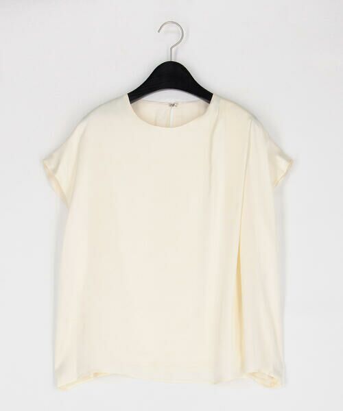 《デザイン》アシンメトリーバランスのタックで、フロントにドレープのポイントをつくったブラウスです。腕肩シルエットをカバーするフレンチ袖です。後ろネック開閉部分に、一粒ラインストーンのホックを使用しています。アクアウールジャケットインナーとして、丈感・量感ベストなバランスをとっています。アクアウールパンツにタックインかタックアウト+アクアウールジャケットパーツのベルトで、ウエストマークのスタイリングもおすすめです。《素材》シルクサテンにサンドウォッシュ加工をし、パウダータッチにすることで、しなやかなドレープ感を表現しています。