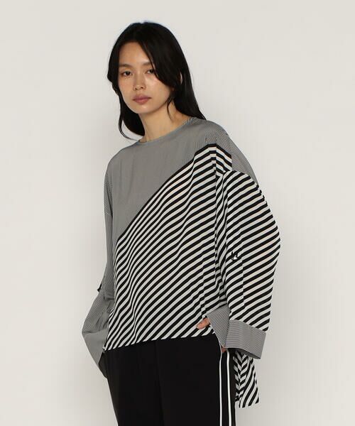 柄違いの左右の袖や、切り替えたような身頃の柄の出方などストライプの組み合わせが楽しいブラウスです。