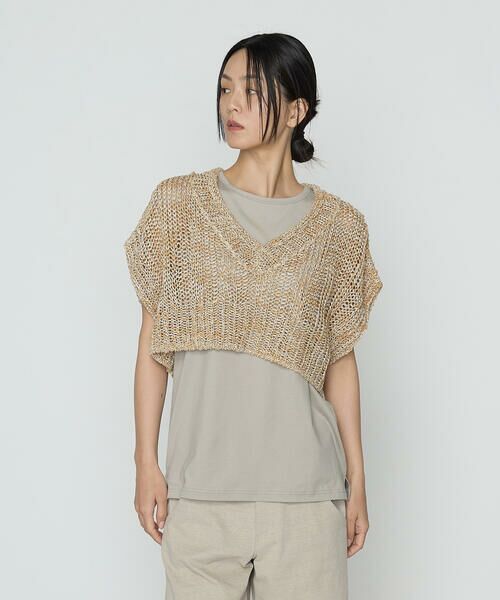 《デザイン》素材を活かして、ざっくりとワイドリブで編み上げています。糸の特性で大変ほどけやすく試行錯誤の末、製品にすることができています。ネックリブの付け方は、ナチュラルだけどスポーティーになるように、ワイドリブにして境目が目立つように仕上げています。《素材》「美濃和紙」を細巾にカットした意匠糸です。1300年以上の歴史を持つ伝統技法で漉かれ続けてきた美濃和紙は、薄さと丈夫さ、美しさが特長です。タンクトップ(商品番号:77-06TK04-205)は別売りの商品になります。