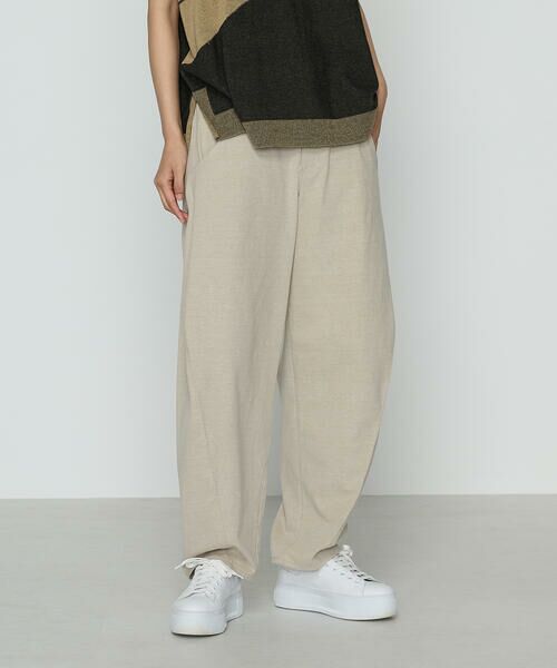 《デザイン》トレンドのバレルパンツをジャージー素材でつくっています。一見ジャージーに見えない、ビンテージ風の表情豊かな素材は、こなれたムードを醸し出すだけでなく、着心地の良さも抜群です。新しいシルエットですがしわにもなりにくくお手入れもしやすいので、ワードローブに取り入れていただきやすいパンツです。《素材》ビンテージルックを引き出すために前工程の手順を組み替え、染料のブレンドにまでこだわった素材です。さらには経年変化や着用感を出すための特殊起毛も施し、強タンブラー加工で何度も洗濯を繰り返したような質感に仕上げています。《セットアップ》同素材のレースアップ半袖シャツ(商品番号:77-06HK05-205)と合わせて、セットアップとしてお召しいただけます。※在庫がない場合もございますので、予めご了承くださいませ。