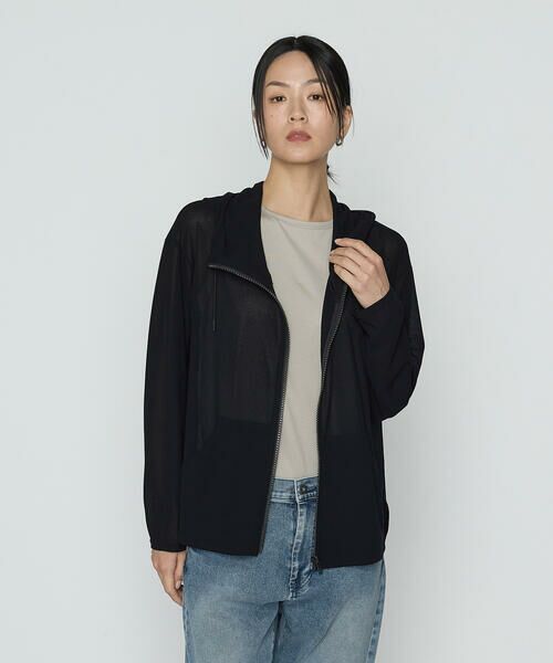 日焼け対策を考慮しての長袖、首元をカバーするスタンドフードですが、素材の上品な透け感で、軽やかな仕上がりになっています。