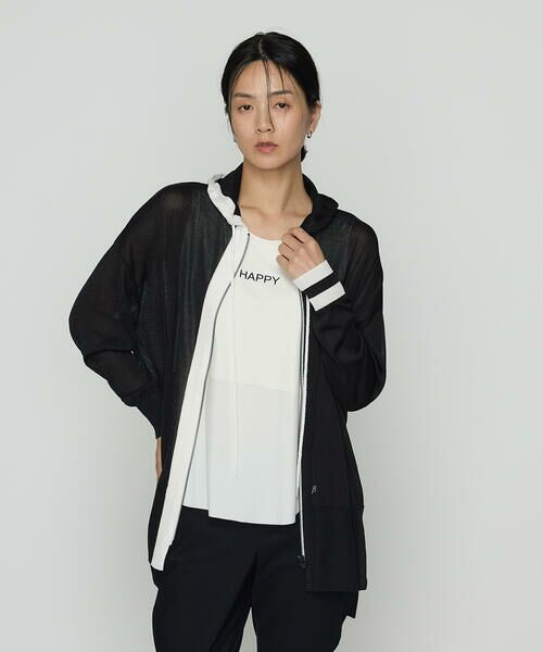 ホワイトラインを左右不対象に入れたニットパーカーです。