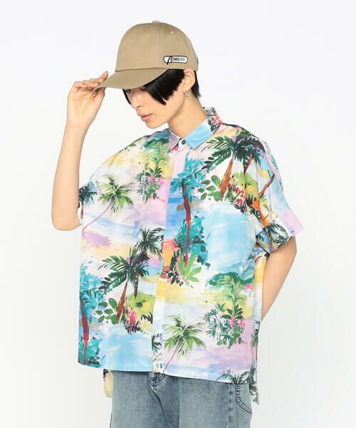 穏やかなリゾート風景を描いた総柄プリントのシャツです。