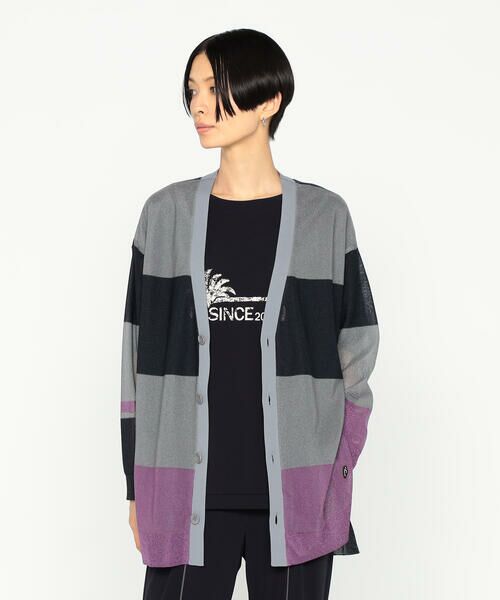 きれいなパープルが印象的で袖はアシンメトリーな配色と編み組織になっており、スポーティだけにとどまらない技ありカーディガンです。