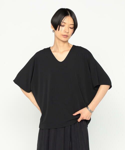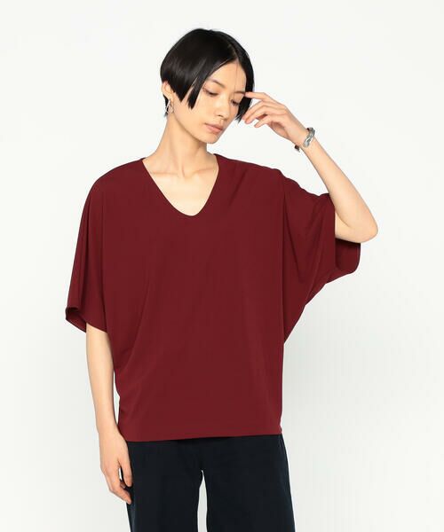 《デザイン》ブラウス感覚ジャージープルオーバーです。ドルマンスリーブのゆったりとした包み込むようなフォルムのTシャツです。袖下のカーブで程よく分量を調整し、裾に向かって窄めたことでシルエットが大きく見えすぎないのがポイントです。襟ぐりのVネックは、涼し気な見た目はもちろん、首元をすっきりと見せてくれます。袖ぐりの裏バインダーや裾のルイスの始末など、ブラウスのようなきれいめな仕様にしたことで、カジュアル見えしすぎないようにしています。《素材》〔ユニチカ社〕が特許を持つぺオスの糸を使用した、高反撥性スムース素材です。とろみのあるドレープ性、ソフトな膨らみが特長で、着心地の良さ、美しい仕立て映えを追求しています。