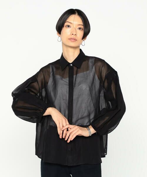 《デザイン》袖山から袖口に繋がるタックを取り、さらに袖口にはギャザーを加えて大人のパフスリーブをつくっています。袖口のゴムは内側に倒しての着用がおすすめです。裾は両サイドに釦があり、カシュクールとしても着用可能です。素材の透け感で重なりに奥行が出て、ワンランク上の着こなしになります。インナーにはハンマーサテンタンクトップ(商品番号:28-10BK16-205)を合わせるのがおすすめです。肌離れが良い素材なので、夏場でも涼しく着られます。コットン100%なので、快適な肌触りです。《素材》シアー感のあるオーガンジー素材です。シルケット加工を施すことで、シルクのような光沢感とハリ感を出しています。細い糸の強撚糸を使用することで、繊細でドライなタッチを表現です。生地の状態でワンウォッシュすることで、こなれたナチュラルなシワ感に仕上げています。