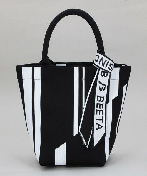 《デザイン》ランダムストライプ柄のニットトートバックです。前胴側には斜めにカットしたような柄の切り替えを入れ、取り出し可能なBEETAリボンをポイントに付けています。モノトーンでどんなスタイリングにも馴染みやすいアイテムです。サイズ感はペットボトルが丁度入る大きさです。ニットなので入れすぎ注意です。《素材》特殊加工により、ボリューム感とストレッチ性を高めたポリエステル先染め糸です。染色時にソフト加工を施し、柔軟性にも優れています。通常のポリエステル糸に比べ、軽量感のある製品を生み出すことができ、立体的な柄表現に適しています。