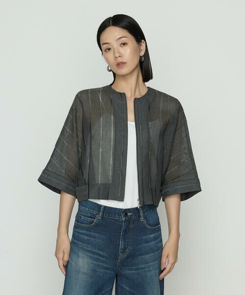《デザイン》ショート丈のブルゾンは、非常に軽い仕上がりです。袖口裏には太幅のグログランテープをたたき、ハリ感を持たせています。裾や袖口、襟ぐりなど、綺麗に仕立てるために本来芯地貼りますが今回は生地の特性上芯地が貼れないため、裏側に薄い生地をかませてその生地に芯地を貼り仕立てることで、表から見た時に美しく仕上がるよう仕様にこだわっています。前後の裾のタックで、ほのかに丸さのあるシルエットです。《素材》たて糸麻、よこ糸ナイロンのカラミ組織です。透け感があり清涼感のある素材です。部分的にたて糸を減らしよこ糸を浮かせる空羽組織を使用しています。これによりストライプ柄を表現しています。麻のドライタッチでナチュラルな見え感にナイロンリリヤン糸の光沢で、ナチュラル過ぎない素材に仕上がっています。