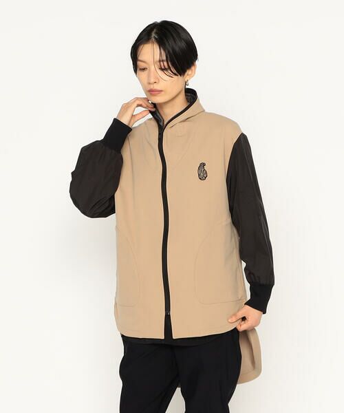 《デザイン》袖部分を黒のタッサー生地で切り替えたロングパーカです。前後差のある丈とラウンドカットの裾で動きのあるシルエットに仕上げています。フードまで続くマットブラックのファスナーで全体を引き締め、胸元のゴルフバッグワッペンで遊び心をプラスしています。、《素材》本体:ソフトポリエステルを肌面に使用した、肌ざわりの良い二重織素材です。軽量で伸縮性に優れたポリエステル100%の2WAYストレッチはしなやかな着心地で、色褪せや型崩れがしにくく速乾性に優れています。袖部分別布:高密度で織られた生地に耐久撥水が施されることにより、ノンコーティングでもソフトな風合いを維持しており、撥水性と透湿性をあわせ持った素材です。袖口部分別布:フィラメントポリエステルを使用したテレコ素材です。光沢がありしっかりとした肉感、キックバックの良さが特長です。