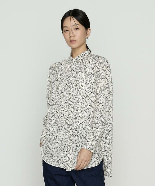 《デザイン》数種類のめがねをランダムに散りばめた、遊び心あるプリントのシャツです。前立てを二重に仕立て、動くたびにひらひらと揺れる表情がポイントです。さらりとした着心地で重ね着もしやすいため、ニットカーディガン(商品番号:77-06IM09-205)と合わせたコーディネートもおすすめです。《素材》緯糸に撚糸を使用しており、適度な伸縮性と小シボのような表情を持たせています。また、小シボにすることにより、肌につきすぎずさらっとした着心地を実現した素材です。