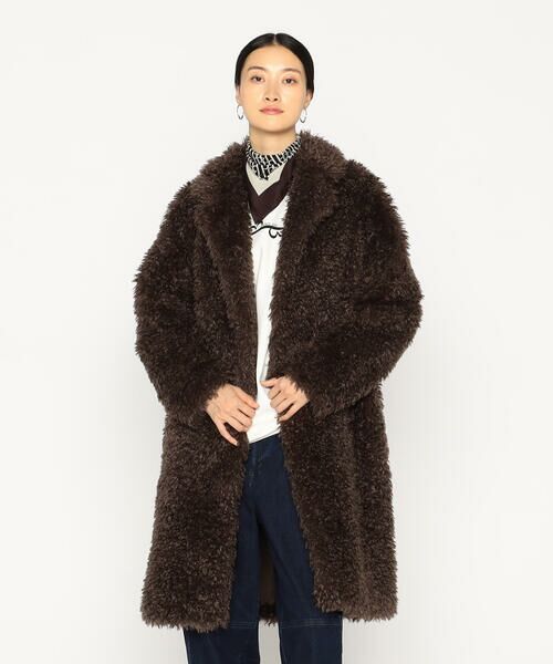《デザイン》ふわふわの手触りが心地よいエコファーコートです。見ため以上に軽い着心地で、柔らかさと暖かさを兼ね備えています。裏地にはオリジナルのββ柄プリントバンダナをあえて使い、ハンガーにかかった姿まで絵になる一枚です。ブラウンのシックなカラーが際立つ、この秋冬におすすめのコートです。《素材》カルガンラムの毛皮のように、くるくるとカールした毛を表現したエコファー生地です。ふわっと柔らかい手触りと、何よりも軽いのが特長です。