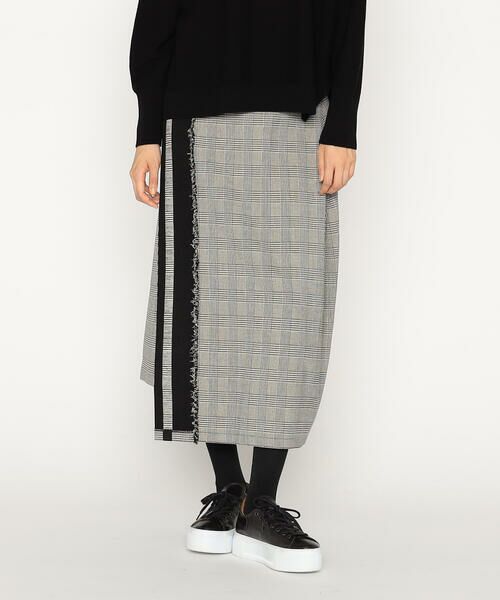 右側だけ丈を短くした、アシンメトリーなシルエットのラップ風スカートです。