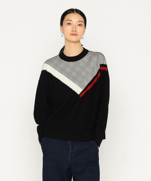 《デザイン》胸にグレンチェックを三角形にはめ込んだニットプルオーバーです。その際には赤と白のラインを配してスポーティな雰囲気に仕上げています。袖は少しボリューム感をプラスしています。《素材》通常のウールよりも軽くて膨らみがあり、保湿力に優れたラムウールを混紡績した素材を使用しています。チクチク感が少なく、柔らかくスポンディッシュな膨らみで、肌触りの良い素材です。