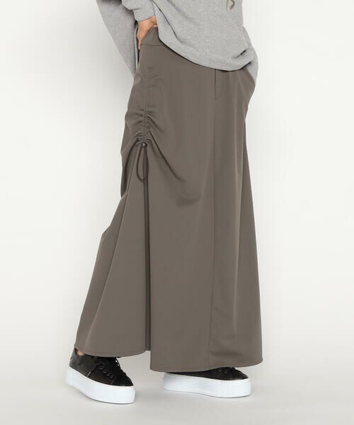 《デザイン》右脇のドローストリングがポイントのアシンメトリースカートです。コードを絞らないときはシンプルなAライン、絞ると立体的なシルエットに変化し、アレンジを楽しめるデザインです。裏起毛のジャージー素材にウエストゴム仕様で、快適な着心地と暖かさを兼ね備えた一枚です。《素材》トリコット編みで裏を起毛しやすいように組織をつくっています。深みのある起毛と、マイクロナイロンファイバーメリルの柔らかさが特長のハイコンフォート素材です。