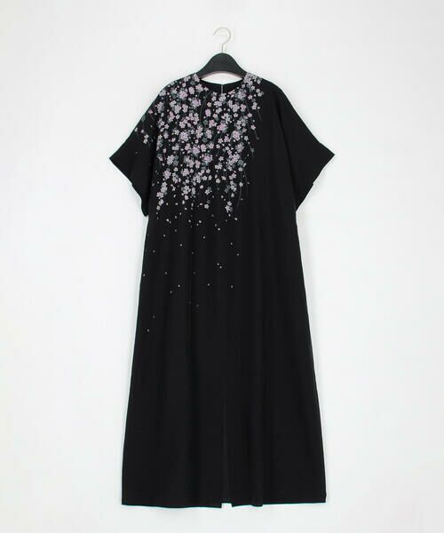 《デザイン》袖部分にハリと、量感のある身頃で、すとんとした落ち感を表現したドレスです。右前身頃にしだれ桜のプリントをのせています。素材のシボ感が、無地空間の多いデザインに豊かな表情をつくっています。《素材》ナイロンのハリと、ビスコースのシルキーさ、落ち感とドレープ感がほど良くミックスされたオーガンジー素材です。染めによるシャンブレー感で色の深みとシボができ、豊かな表情をつくっています。無地空間を多くしたデザインで、夜空に映える、しだれ桜を表現しいています。