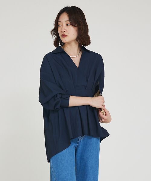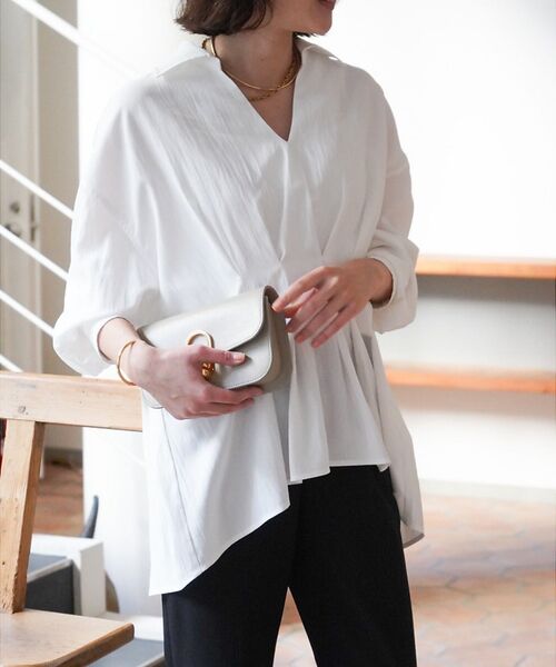 *Detail*ウエストタックが生み出す立体的なシルエットで、こなれ感のある着こなしが叶うスキッパーシャツ。程よいハリ感と軽やかな風合いで、シーズンレスに活躍します。*Coordinate*デニムと合わせてカジュアルに、スラックスと合わせてキレイめに。ボトム次第でオンオフ問わず着回せる万能アイテムです。*サイズについて*裾位置ですが、6㎝前後差がございます。