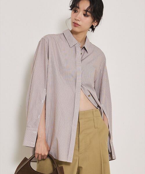 *Detail*着丈を長めに設定し、さらっと着るだけでこなれた印象に仕上がるレギュラーシャツ。袖口のスリットデザインが、抜け感を演出するさりげないポイントに。肌寒い季節には上からニットを重ねて、釦を外したレイヤードスタイルもおすすめです。*Coordinate*スリムパンツ(32510050008)と合わせれば、縦長シルエットですっきり見えが叶います。袖スリットから手首を見せることで、軽さと抜け感をプラス。シャツの前だけインしたり、ニットを重ねたりと着こなしの幅が広がります。