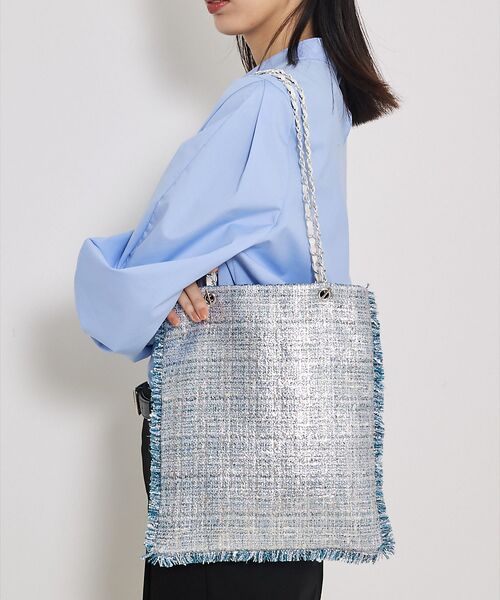 *Detail*ジレ(32510030001)と同素材のハクツイードで仕立てたフリンジバッグ。A4サイズがしっかり入る実用性と華やかさを両立。シンプルな着こなしに合わせるだけで、洗練された印象に。※本製品は多くの荷物を入れる設計ではございません。※適度な荷物量でのご使用を推奨しております。