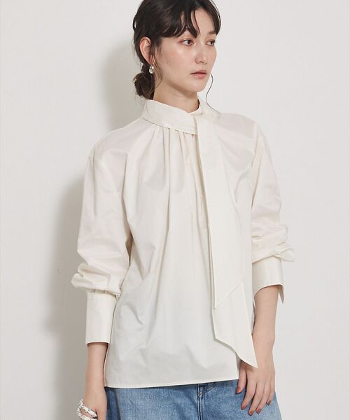 ボウタイを外してシンプルに着こなせば、ジャケットインにも万能に活躍します。