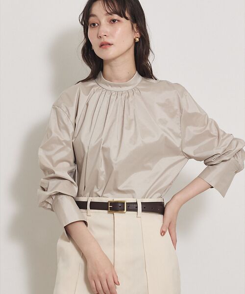 上品なツヤ感を持つタフタ素材を使用したスタンドカラーブラウス。