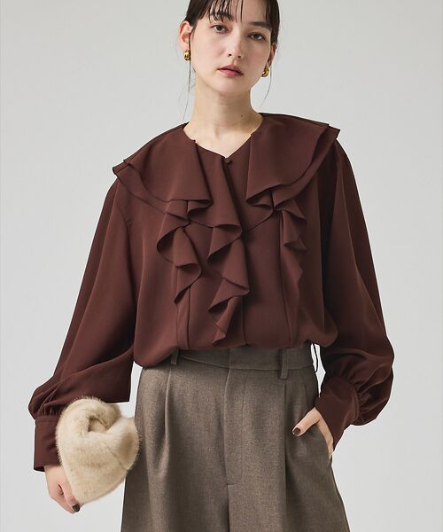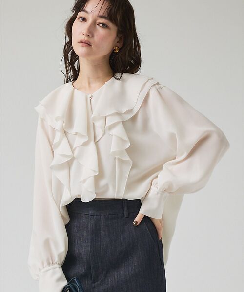 *Detail*顔まわりを華やかに彩るラッフルデザインがポイントのブラウス。ショール風の襟が上品さを引き立て、クラシカルな印象に。軽やかな素材感で、オンオフ問わず着回しやすいアイテムです。*Coordinate*ワイドパンツと合わせれば、バランスの取れた大人クラシックな着こなしに。デニムにインすれば、甘さを抑えたカジュアルスタイルに仕上がります。ジャケットのインナーとしても映えるデザインで、オフィスにもおすすめです。日本製